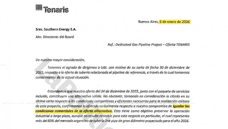 Con ese panorama, el consorcio Southern Energy decidió aceptar la propuesta de los indios y el 23 de diciembre firmó el contrato. Un día después, Tenaris hizo una nueva oferta donde la diferencia con Welspun se reducía a unos 40 millones de dólares, pero desde el consorcio consideraron el tema estaba cerrado.