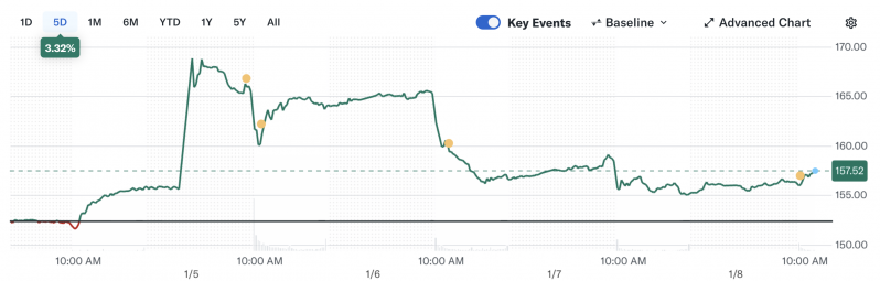 Salto de la acción de Chevron tras la captura de Maduro. Fuente: Yahoo Finance.